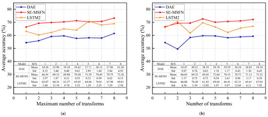 On the benchmark dataset 2016A, SE-MSFN achieves an optimal recognition accuracy of 62.96%, whereas using the SigAugment proposed in this paper, a SOTA mean average accuracy of 64.44% can be easily achieved on the LSTM2 model without changing the model structure. The average accuracy of the DAE and SE-MSFN models also improved from 58.45% and 62.96% to 62.63% and 63.94%, respectively. The improvement was greater for lightweight models than for larger models such as the SE-MSFN (4.18% vs. 0.98%). Individual augmentation transforms, for the most part, improve the model’s recognition accuracy; however, there are some that have a negative effect on a specific model; for example, training SE-MSFN on the 2016A dataset with Rot and FCS decreased the accuracy by 0.24% and 0.68%, respectively. Individual transformations perform differently across models and datasets. Individual transformations that are most helpful for DAE, SE-MSFN, and LSTM2 on the 2016A dataset are Rot, CS, and FCS, in that order. FCS, SP, and Rot are the most helpful individual transformations for DAE, SE-MSFN, and LSTM2 on the 2016A-1 dataset, while our proposed SigAugment method consistently works, the two SigAugment transformation selection modes are only slightly different for different datasets and models. This demonstrates that our proposed SigAugment method can be applied effectively to a variety of datasets and deep neural network models.
