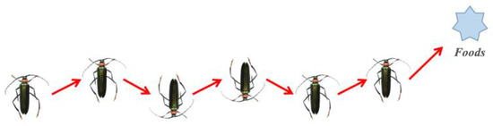 The BAS algorithm is inspired by the foraging behavior of beetles in nature (see in Figure 1). Beetles have left and right antennae, which can sense the intensity of food odors in the environment. Beetles move toward food according to the difference in the odor’s strength as perceived by the left and right antennae. When the intensity of an odor that is perceived by the left antenna is greater than that by the right antenna, the beetle moves toward the left. Otherwise, the beetle moves toward to the right. The smell of food can be regarded as an objective function. The higher the value of the objective function, the closer the beetle is to the food. The BAS algorithm simulates this behavioral characteristic of beetles and carries out an efficient search process.