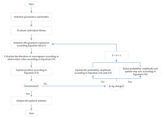 In addition, the search step size of the BAS algorithm also affects the convergence rate of the algorithm. If the step size is too large, the convergence rate of the QBSO algorithm will be reduced. If the step size is too small, it may lead to search failure. Therefore, this study changed the step size updating strategy: when the global optimal solution changes, the step size is updated according to Formula (16). Otherwise, the decay of the step size accelerates. In order not to affect the search accuracy, the value of is set to 0.8 according to the original study. The flow of the QBSO algorithm is shown in Figure 3.