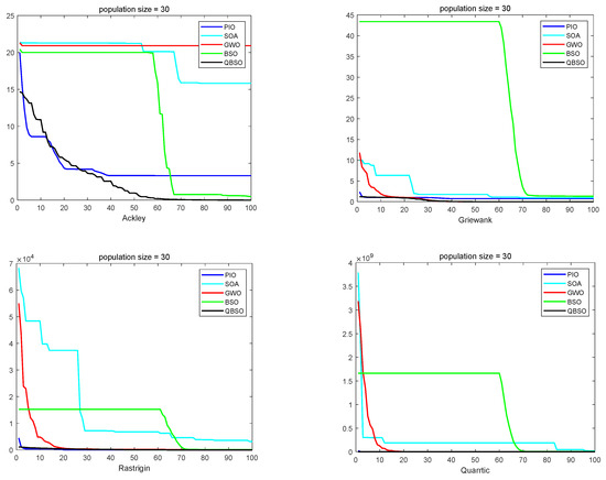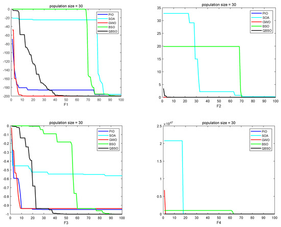 We randomly chose 1 of the 100 independent runs and plotted the algorithm optimization iteration process as a graph, as shown in Figure 4. Considering that when the population size was eight, the optimization results of the PIO algorithm, SOA, and GWO algorithm were so different from the QBSO that it was easy to compress the QBSO into an approximate horizontal line in the figure, we omitted the iterative curve plot here for the population size of eight.