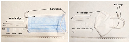 Biologically uncontaminated disposable surgical and FFP2 masks were collected after regular use. Prior to pyrolysis tests, the composition of the masks was identified by Fourier-transform infrared spectroscopy (FTIR), using a Perkin-Elmer Spectrum 65 spectrophotometer. For this, the masks were separated into their layers, as shown in Figure 1. The surgical mask contains three layers, and the FFP2 mask contains five layers. In addition, both masks contain a nose bridge and ear straps, which are discarded.
