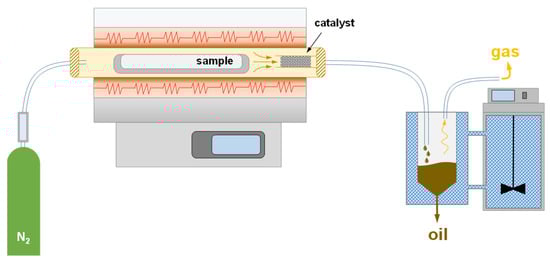 The pyrolysis and catalytic pyrolysis were carried out in a horizontal tubular furnace with integrated control systems provided by Nabertherm with a length of 450 mm and an inner diameter of 50 mm. The schematic layout of the experimental setup is shown in Figure 2.
