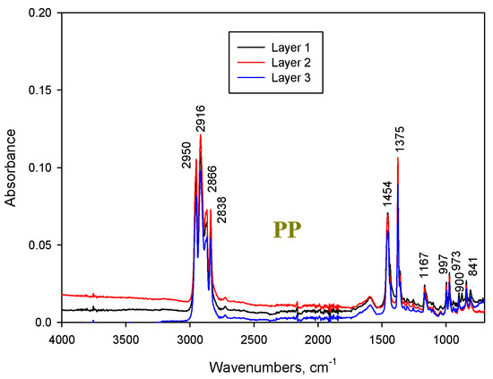 Regarding assignation to functional groups, the most prominent peaks of polypropylene are assigned to asymmetric stretching of CH3 (2950 cm−1), asymmetric stretching of CH2 (2916 cm−1), CH3 stretching (2866 cm−1), CH3 symmetric bending (1454 cm−1 and 1375 cm−1), C-H wagging and CH3 rocking vibration (1167 cm−1), CH3 rocking vibration and C-C stretching (997 cm−1 and 973 cm−1), and C-H rocking vibration (841 cm−1) [42].