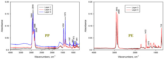 Layers 1, 2, and 3 of the surgical masks show identical peaks in the range of 2938 to 2950 cm−1 and in the range of 841 to 1454 cm−1. These peaks are characteristic of the polypropylene (PP) FTIR spectrum, so this mask contains three layers of this material. However, FFP2 masks have two types of spectra. Layers 1, 2, and 5 have a spectrum that is practically identical to that of surgical masks, that is, these layers correspond to polypropylene. On the other hand, layers 3 and 4 present a spectrum with peaks characteristic of polyethylene (PE), highlighting the peaks at 2915, 2848, 1472, 1375, and 718 cm−1 [18]. Therefore, the FFP2 mask contains five layers, three of polypropylene and two of polyethylene.