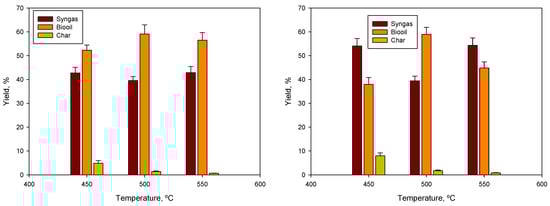 The yields of the syngas, biooil, and biochar of the thermal pyrolysis of surgical and FFP2 masks at different temperatures are shown in Figure 5.