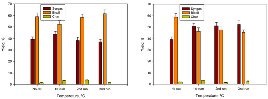 In the catalytic pyrolysis experiments, the catalyst was placed ex situ with 5% of the sample mass. Catalyst was mixed with glass balls to prevent clogging. The catalyst was placed at the outlet of the furnace so that the volatiles were in contact with the catalyst. From this point, the catalytic pyrolysis operating procedure was the same as the standard pyrolysis experiment performed at 500 °C (the temperature that provided higher liquid product yields). Once the experiment was over and the reactor reached room temperature, the catalyst was recovered. Fractions yields were obtained using Equations (1)–(3). Finally, the catalyst was calcined at 550 °C for 3.5 h in air atmosphere to regenerate the catalyst and then it was kept free of moisture until the next run.