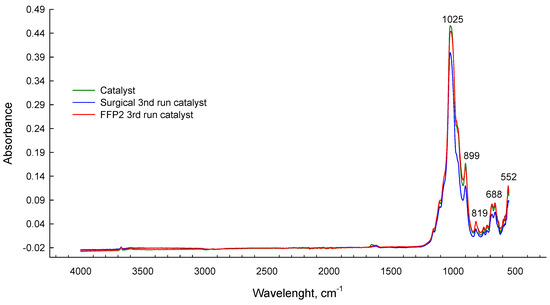 Furthermore, the most prominent peaks of the polyethylene layers of the FFP2 masks, which are 2915 cm−1, 2848 cm−1, 1472 cm−1, 1375 cm−1, and 718 cm−1, correspond to CH2 asymmetric stretching, CH3 symmetric stretching, bending deformation, CH3 symmetric deformation, and split CH2 rocking deformation, respectively [43].