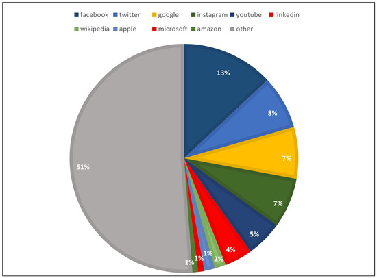 In our study, the ranking of the site list was sorted out based on Alexa.com Top 50 Saudi Arabia and global websites determined in 2022 and categorized according to different fields, including Search Engines, News and Social Networks, E-Commerce, Law and Government, Dictionaries and Encyclopaedias, Online Designs, Banking, Education and Games. Table 2 shows the crawled websites with their categories as well as the total number of websites Alexa found linking to this site and the result indicates that the most popular Saudi Arabia website was google.com.sa with 6,458,120 sites linking in. Figure 2 summarizes the distribution of the aggregators discovered on the most 50 websites during the crawling process and the result shows that facebook.com is the leading family of controlled aggregators with 11,492,297 sites linking in. While qiwa.sa site occupies the least aggregator with 23 sites linking in.