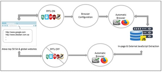All these steps are followed to test our experiment and preserve websites from being tracked. To evaluate the effectiveness of the PPTs in terms of blocking or enabling tracking JSec programs. We performed a quantitative analysis to quantify the number of blocked and enabled tracking JSec programs when handling requests from the most common 50 services. Considering the dynamic nature of the websites and different advertisements appearing at different times when accessing the sites, the experiment was performed simultaneously to ensure that the number of JSec programs remains constant. (Figure 3) summarizes the general structure of the analysis process.