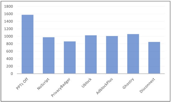 The next focus is how fast the browser can render the pages. The page load time or PLT using Chrome DevTools [25], as shown in (Figure 7). Chrome DevTools is a collection of web developer tools integrated directly into the Google Chrome browser. It helps edit pages directly from within the browser and diagnose problems easily. Also, it includes prototyping CSS, debugging CSS and JavaScript, and analyzing load performance. A general conclusion of the study is that privacy protection tools improve the loading time of web pages by blocking incoming requests from third-party services. Comparing initial results (PPTs Off) with each tool, we observe that PPTs decrease the time it takes to render the page by filtering many third parties to contact. Ghostery improves the average load time by 36.2% over the standard browser. Privacy Badger, AdBlock Plus, Disconnect, and uBlock increase the loading speed of the pages by 28.4%, 23.5%, 23.3%, and 22.6% respectively. Furthermore, NoScript also reduces load time with a minor improvement of 7.1%.