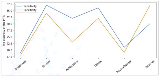 where True Negative (TN) is the number of tracking JavaScript programs that are correctly blocked, False Positive (FP) is the number of functional JavaScript programs that are incorrectly blocked. (Figure 5) illustrate the accuracy of the privacy protection tools based on Sensitivity and Specificity.