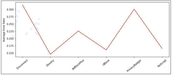 Based on the results, we can conclude that PP-Tools’ true positive rates vary from 69% to 87%, and true negative rates vary from 68% to 87%. As expected, Ghosteryt has the highest Sensitivity rate of 87% due to allowing most JavaScript programs to run in-page, at the expense of its poorest Specificity rate. The next best are uBlock, Adblock Plus, NoScript, Privacy Badger, and Disconnect with 86%, 82%, 80%, 71%, and 69% respectively. In spite of this, NoScript achieves the highest specificity rate of 87% since it is the highest blocker of external third-party services. Followed by Ghostery, uBlock, Adblock Plus, Privacy Badger, and Disconnect with 84%, 82%, 73%, 69%, and 68% respectively. Furthermore, we observed that Ghostery achieved the lowest average error rate (AER) of 0.145, which is calculated as the average of false positive and false negative rates. However, Disconnect achieved the highest average error rate of 0.315 due to its poorest sensitivity and specificity. The average error rate (AER) reports in (Figure 6).