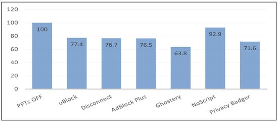 After that, we examined the speed of the browser to render the web page finding that, blocking third-party services through PPTs substantially reduced the time it takes to load a web page when compared with the original result (PPTs Off). For example, Ghosteryimproves the average load time by 36.2% faster than the baseline, while Privacy Badger reduces the load time by only 7.1%.