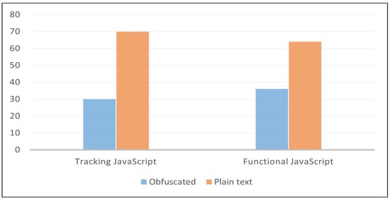 Further analysis is that we investigated the presence of obfuscation in JavaScript programs. The purpose is to verify the use of obfuscation in web tracking, and how it affects privacy protection tools’ classifications. To the best of our knowledge, this is the first analysis study of the PPTs in terms of their effectiveness in detecting obfuscated JavaScript programs. Obfuscation in JavaScript involves transforming the visual representation of the code into an altered version that is extremely difficult to read, understand, and reverse-engineer without changing its functional characteristics [26]. Web trackers commonly apply obfuscation methods in JavaScript codes to avoid detection by various privacy protection software and conceal their malicious intentions. Web developers may also use obfuscation and code protection methods to protect their code. However, obfuscation can be utilized by malware writers and attackers to bypass security measures. In (Figure 8) we observed that 30% of the tracking JavaScript programs are obfuscated while 70% are plain-text code. We also observed that 36% of the functional JavaScript programs are obfuscated while 64% are plain-text code.
