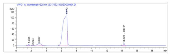 Figure 1 shows the chromatogram of the standard solution, in which DEHP elutes at retention time of 14.3 min.