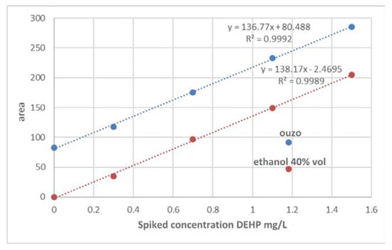 - In a real sample of Ouzo, 4 independent spikes of DEHP were made at concentrations of 0.3, 0.7, 1.1, and 1.5 mg/L and measured following the entire analytical procedure. Additionally, unspiked “ouzo” was measured. The spike was conducted by adding a small volume of a dense standard to avoid dilution of the sample.