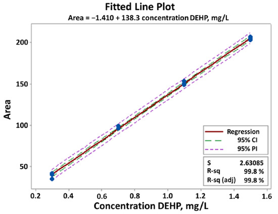 In the unknown samples to be analyzed, the average expected DEHP concentration is 0.7 mg/L. To check the linearity, 12 DEHP standard solutions (4 concentrations × 3 independent replicates) were measured, whose concentrations ranged from 40 to 200% of the expected [6]. Specifically, 3 independent replicates were measured for each of the concentrations: 0.3, 0.7, 1.1, and 1.5 mg/L DEHP in a 40% v/v ethyl alcohol matrix. The 12 standard solutions were measured directly on the liquid chromatograph skipping the extraction step.