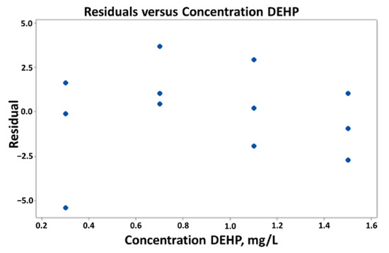 The plot of residuals with respect to DEHP concentration is constructed, Figure 6. The points in this plot are randomly distributed around zero and do not show any particular pattern [19]. Therefore, no deviation from linearity is seen.