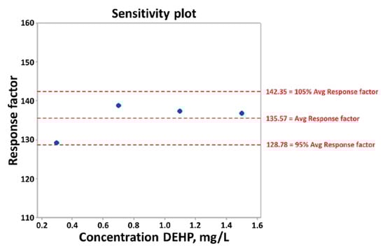 For its construction, the response factor (area/concentration) was first calculated. In the sensitivity diagram, Figure 7, it is observed that there is no point outside the interval ± 5% from the average of the response factor [11]. This confirms the linear range of the method for the range of standard solutions used 0.3–1.5 mg/L DEHP.