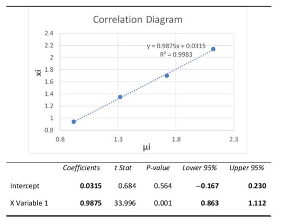 Then, the correlation diagram, Figure 8, is constructed, in which the experimental values obtained from the method under validation, xi (y-axis), are presented in terms of the corresponding known concentrations of the samples, μi (x-axis). Additionally, the regression line is plotted using the least squares method. Finally, with the help of Excel we obtain the regression analysis table, a part of which is shown in Figure 8.