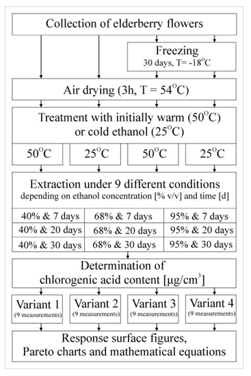 The above examples indicate that the biological activities of raw plant materials depend on many factors (the raw material, environmental factors, mutual quantitative relationships of individual chemical compounds, epigenetic reactions of plants to stressors, etc.), and therefore a very strict and precise determination of all the health-promoting properties of plants is very difficult, if not impossible, at the moment. Nevertheless, an attempt to build mathematical models based on a smaller amount of input data may be justified, as they gives an opportunity to select narrowed technological ranges during the processing of herbal raw material in order to obtain the optimal amount of the selected biologically active substance (in terms of the efficiency or energy consumption of the process). One such optimization method that can be used in herbal processing seems to be the response surface methodology, which was used in the experimental part of this work in relation to ethanolic extracts in terms of the content of chlorogenic acid obtained from dried elderberry flowers. Thus, the aim of this work was to optimize the content of chlorogenic acid in ethanol extracts of elderberry flowers using the response surface methodology.