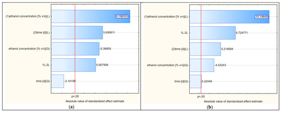 The analysis of the response surface makes sense when the variables of the model, i.e., in our case, the concentration of ethanol and the extraction time, significantly affect the obtained shape of the curves. It does not have to prove the influence of both factors; at least one is enough. In addition, in RSM analysis, the most common model is not linear but quadratic. Therefore, thanks to this method, it is possible to unambiguously determine whether the linear component (L) or the square component (Q) have statistically significant effects on the model. For the first variable, its linear and square components were analyzed. The same was true for the second variable. Therefore, we obtained information about four components. The fifth and final component that may affect the RSM model was the interaction of the linear components of the principal factors (LxL). The significance of the impacts of these five components were analyzed using a Pareto chart, as presented in Figure 5a.