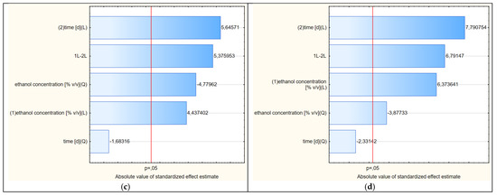 (a–d) Pareto charts showing the statistical significance of the factors of variability affecting the shapes of the response surfaces (2D) shown in Figures 4, 6, 8 and 9, respectively.