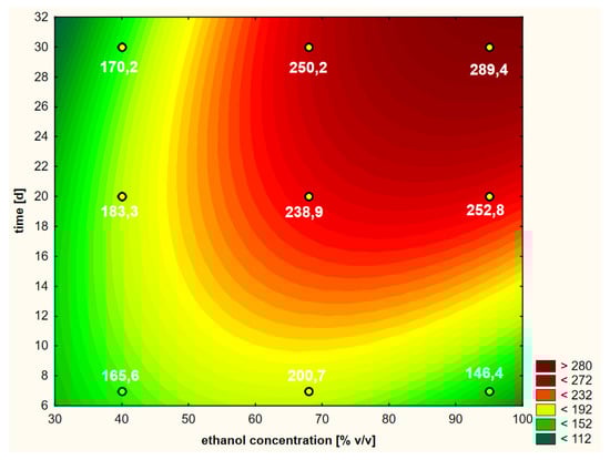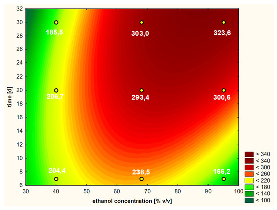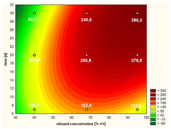 Suggestions of one of the authors indicated that the efficiency of the extraction of biologically active substances with ethanol can be increased if it is warm when added to the herbal raw material [26]. In order to empirically verify this statement, the first variant of the experiment, in which warm ethanol was used at the beginning (heated to 50 °C), was compared with the second variant, in which cold ethanol was used in summer conditions (25 °C). For this reason, the first variant (discussed above) was implemented “hot” and the second was implemented “cold”. The shape of the response surface of this second variant is shown in Figure 6.