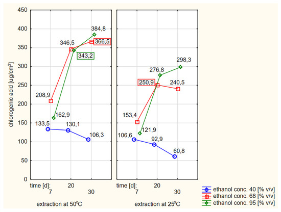 A practical conclusion resulting from the shape of the curves in Figure 4 is the indication of a point or a narrow area for which the extraction efficiency can be optimized with a minimum of time and raw material expenditure. For example, at about the twentieth day of extraction with 68% ethanol, the process can be stopped if its efficiency is at a satisfactory level. It is about 346 μg/cm3 here, i.e., slightly lower than after 30 days of extraction and similar to the level with the use of 95% ethanol for the same time. On the basis of the obtained response areas, it is easier to decide on the shortest possible extraction time and the lowest concentration of ethanol to use in order to obtain a product with a satisfactory content of the active substance in the extract, which in this case, is chlorogenic acid.