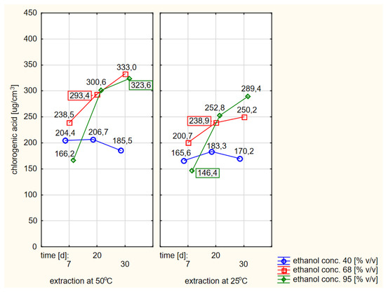 When comparing the absolute values of the contents of chlorogenic acid in extracts obtained by flooding dried elderberry flowers with warm or cold ethanol, a better effect (i.e., a higher concentration) could be found in the case of using warm ethanol. The differences were statistically significant. When grouping the relevant data, for the sake of the clarity of the work, only a simple compilation of individual results was chosen, as shown in Figure 7.