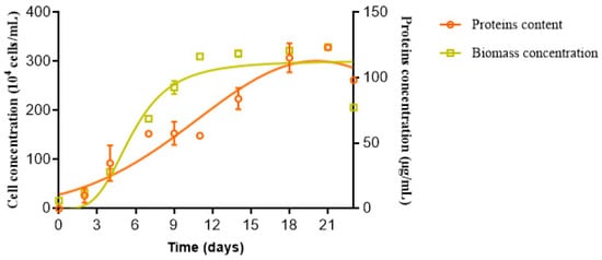 Cell growth and proteins’ accumulation rates of the studied strain were monitored for 22 consecutive days. The microalgal growth was determined by counting using a light microscope (Motic microscope AE 2000, Madrid, Spain) and Malassez counting chamber (Supe Rior, U, 200 mm). Proteins’ concentrations were determined through Lowry method [3] using bovine serum albumin (BSA) as standard.