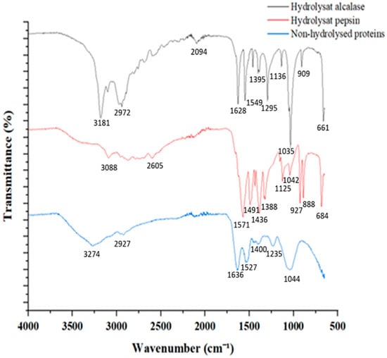 FTIR spectra of Rhodomonas sp. crude protein and peptides produced after alcalase and pepsin hydrolysis.