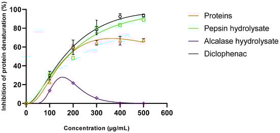 The denaturation of proteins corresponds to proteins losing their secondary, tertiary, and quaternary structures, resulting in loss of biological function [73]. This process could be induced by the application of external stress, such as heat, or by exposure to chemicals, such as organic solvents [15]. Hence, to investigate the anti-inflammatory activity, the ability of protein extract and peptide hydrolysates to inhibit the heat-induced denaturation of albumin was evaluated.