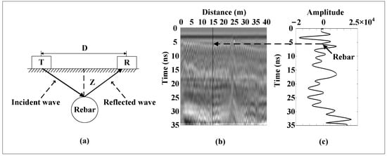 The essential principle of the GPR system is for the antenna transmitter (T) to emit high-frequency electromagnetic waves as brief broadband pulses to the target medium. These electromagnetic waves are subsequently reflected by the medium and received by the radar antenna receiver (R). The electromagnetic wave emitted by T is reflected at the electromagnetic wave impedance interface formed by the rebar and concrete. Part of the reflected wave penetrates the tunnel’s surface and is received by R, and the other part is reflected again by the tunnel surface back to the rebar. This process is shown in Figure 2a.