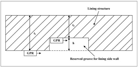In tunnel lining structures, the calibration of the dielectric constant of concrete can be shown in Figure 3. In Figure 3, the dielectric constant of the concrete can be calculated by measuring the propagation time of the electromagnetic wave throughout the tunnel’s lining, the time for the electromagnetic wave to reach the bottom of the lining structure via the groove reserved for the lining sidewall and the depth of the groove reserved for the lining side wall.