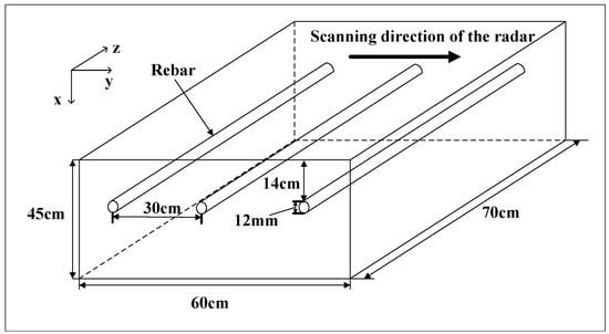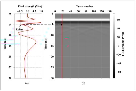 The rebar within the model was not set up as a mesh structure, as the detection target was circumferential rebar within the tunnel’s lining structure. In Figure 5, the lining structure was set to be 60 cm long, 45 cm wide and 70 cm thick, and the diameter of the rebar within the lining structure was set to 12 mm. GPR was scanned in the y-axis direction, and the results of the forward simulation are shown in Figure 6. At the simulated electromagnetic wave frequency of 400 MHz, the hyperbolic feature of the rebar was not clearly recognizable in the B-scan, as shown in Figure 6b. The peak point at the location of the rebar was in the opposite phase of the incident wave, as shown in Figure 6a. This peak point had a smaller amplitude than the amplitude of the adjacent peak point in the same phase.