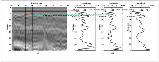 When GPR detects the tunnel, electromagnetic waves first enter from the air to the second lining. The dielectric constant of air is approximately equal to 1, and the dielectric constant of concrete is approximately equal to 6–9 []. According to Equation (4), the phase of the reflected wave at the air–lining interface is opposite that of the incident wave. Then, the electromagnetic wave propagates in the concrete to the rebar. The dielectric constant of the rebar is much larger than that of the concrete, and the rebar totally reflects part of the electromagnetic wave. As a result, the reflected waves from the concrete change, as shown in Figure 8b. This variation is because the dielectric constant of the rebar is considered to be infinite [], whereas the dielectric constant of concrete is 6–9. Therefore, according to Equations (1) and (4), the reflection coefficient is negative when the electromagnetic wave propagates from the concrete to the rebar. Electromagnetic waves propagating in concrete are interfered with by the rebar, causing the reflected waves from the concrete to fail to attenuate at a certain rate and to show up in the A-scan as peaks with the opposite phase of the incident wave having a smaller amplitude than the adjacent peaks. These peak points are simultaneous for the hyperbolic shape of the rebar, as shown in Figure 8a.