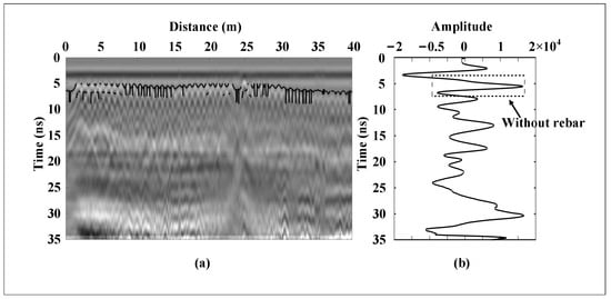 According to these peak points, the hyperbolic shape of the rebar is reconstructed in the B-scan, as shown in Figure 9a. In Figure 9a, the reconstructed curve reflects the hyperbolic feature of the rebar, but discontinuities appear in some regions. Therefore, the A-scan was extracted from the discontinuous regions, as shown in Figure 9b. The reflection signal of the rebar was not detected in these regions, which is the reason for this phenomenon.
