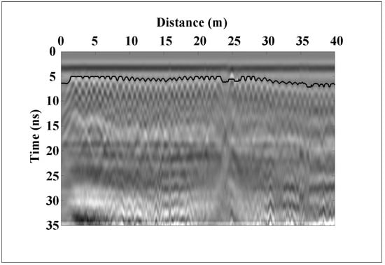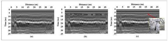 When electromagnetic waves pass through different media, they are partially absorbed and reflected by the media [,]. This phenomenon can cause significant changes in the waveform and electric field strength of the reflected waves from the medium. Therefore, the differences in electromagnetic properties between media are used to recognize buried objects through the time–frequency analysis of reflected waves. Lucia et al. [] calculated the attenuation coefficients for different layers based on GPR signal attenuation and the electromagnetic property of the medium. The resistivity values were then assigned to the other layers based on the attenuation coefficient, resistivity and dielectric constant. In addition, envelope functions of traces previously corrected for geometrical effects were created to detect the interface of the medium and to generate local attenuation curves and radioactive fraction bands before calculating the attenuation coefficients. Li et al. [] determined the position of the tunnel lining by using the attenuation and reflection coefficients. When an electromagnetic wave is transmitted from the air (or second lining) to the second lining (or first lining), the reflection coefficient is negative (i.e., the reflected wave is in the opposite phase of incidence). In the A-scan, the lining is located at inflection points determined by the reflection and attenuation coefficients of the electromagnetic waves in the transmission medium. The recognition of the tunnel lining layer is achieved by using these inflection points. Yan et al. [] studied the propagation of electromagnetic pulses in wind-formed sands with different water contents because GPR signals respond specifically to changes in water content during propagation. The results showed that the wind-formed sand’s dielectric constant and conductivity increased nonlinearly with an increasing water content. The attenuation coefficient of the EMP increased parabolically. At the same time, the time waveform fluctuated significantly at the boundary of the different media. The two-way travel time increased nonlinearly with an increasing water content, and the pulse velocity decreased nonlinearly. In addition, the peak frequency of the spectrum of the signal propagating through the wind-formed sand decreased with an increasing water content. The reflection waveform could therefore be analyzed by using the attenuation and reflection coefficients [,]. The rebar was then identified by reconstructing the hyperbolic features of the rebar in the B-scan.