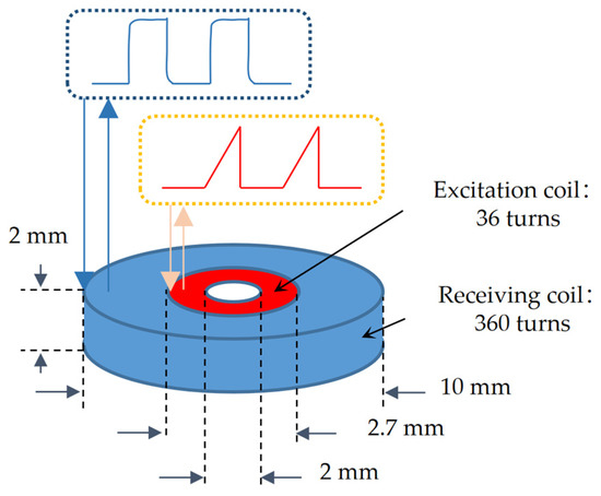 The CPA-PEC sensor is an eddy current sensor with a dual coil probe structure, as shown in Figure 1, in which the excitation coil is fed with a periodic ramp signal with a constant change in current to generate the magnetic field. The receiving coil is placed outside the excitation coil to measure the change in the magnetic field. According to the law of electromagnetic induction, it is known that the voltage across the receiving coil is proportional to the rate of change of the magnetic flux at the coil location. The magnetic flux at the receiving coil is related to the material, thickness, lift-off and shape of the detected metal. Different frequencies of the magnetic field in the metals to be measured attenuate the energy differently, so that the corresponding time domain signal in the receiving coil changes. It can then be extracted from the detection target material, thickness, lift-off, shape and other information through data processing. The working principle is described as follows.