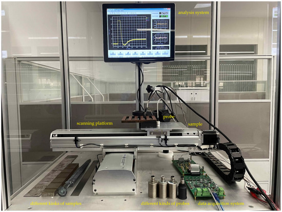 In this section, a system with CPA-PEC is built and shown in Figure 2. The eddy current metal material analysis experimental platform mainly consists of the CPA-PEC probe, the signal generation module, the signal amplification module, the signal receiving module, the 2D scanning platform, the computer and the analysis software of the upper computer.