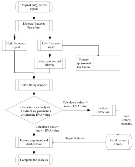 In addition, the signal processing method also determines the accuracy of the eddy current method to identify material properties. Yang et al. presented the wavelet transform method to process the eddy current signal of ferromagnetic metal. The weak defective magnetic field signal inside the ferromagnetic metal plate can be identified because of the interference of magnetic domains [24]. Bolos et al. introduced a new wavelet tool, windowed scale index, that is suitable for studying the aperiodic degree of signal, such as the volatility in crude oil and gold prices [25]. Lepicka et al. applied windowed scale index into tribological behavior analysis of titanium nitride-coated stainless steel, successfully proving that the windowed scale index has a great ability to distinguish different tribological states [26]. Silipigni et al. adopted the pulse compression algorithm to compress other forms of signals into a signal similar to the impulse response. They then processed the corresponding signal of the pulse using the time domain algorithm. Compared to the frequency domain signal, the time domain signal is much smoother and less noisy, facilitating signal analysis [27]. Tamhanne et al. analyzed the degree of corrosion of a 20 mm diameter steel bar by the principal component analysis, allowing the lift-off of 55 mm for corrosion detection [28]. Empirical modal decomposition and a non-smooth signal processing method can efficiently remove the noise from the signal. Liu et al. proposed an improved differential empirical modal decomposition method that can effectively suppress signal aliasing and distortion and significantly improve signal accuracy [29]. Likewise, neural network-based classification has better recognition of signals with low signal-to-noise ratios [30,31,32,33].