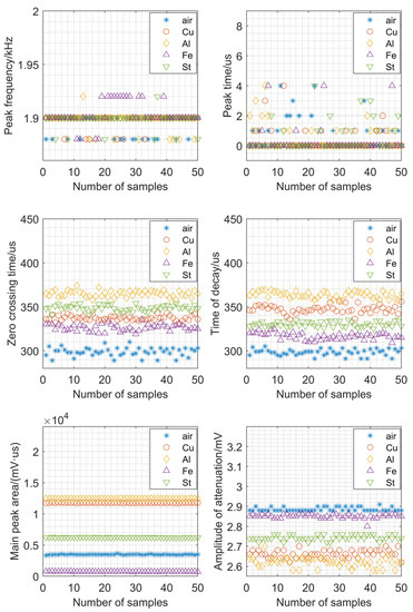 Similar experiments have been applied to Cu, Fe, Al and St, as shown in Figure 6. It can be seen that the features of peak frequency and peak time are meaningless for metal recognition combined with the results of Figure 4. Different from Figure 4, the feature of amplitude of attenuation has contribution in Cu, Fe, Al and St identification. It should be noticed that Cu and Al are easily distinguished by the zero crossing time feature; Fe and St are also easily distinguished by the zero crossing time feature. However, the results in the time of decay feature are the opposite; the feature value is far less distinguishable than the feature of zero crossing time. However, the feature of main peak area is perfect for metal classification: there is no need to make a joint judgment with other features. That is because the four metals differ greatly in electrical and magnetic permeability.