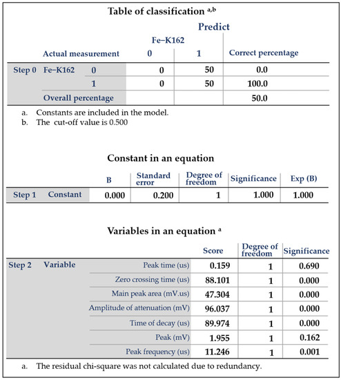 The classification map and the Hosmer–Lemeshaw goodness of fit were performed according to the six features mentioned previously. The number of iterations was set to 20; the predicted value probability, group membership, influence factor and leverage values were turned on; and the residuals of the criteria are analyzed. Then, the Statistical Product Service Solutions (SPSS) correlation and significance of metal signal characteristics can be analyzed.