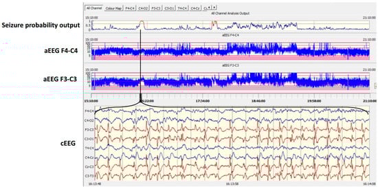 An EEG viewer incorporating an SDA. In the upper panel the output of the SDA is displayed as a graph of seizure probability. The trace changes to red and an annotation is made when a seizure is identified. The interface also displays the cEEG and aEEG (source: [39]).