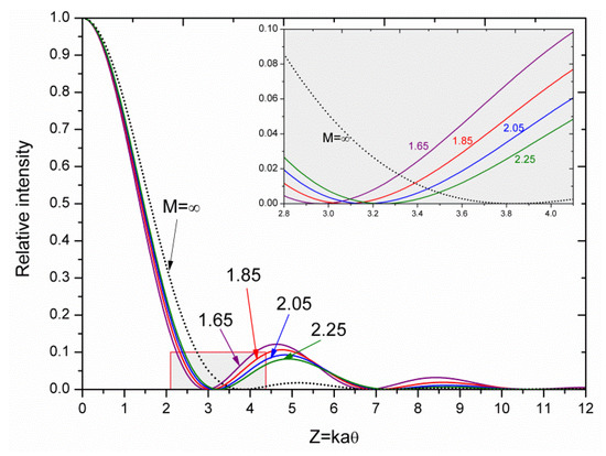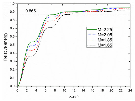According to expressions (2) and (3), the far-field relative intensity and energy for different magnifications were plotted based on different Z values as shown in Figure 2 and Figure 3.