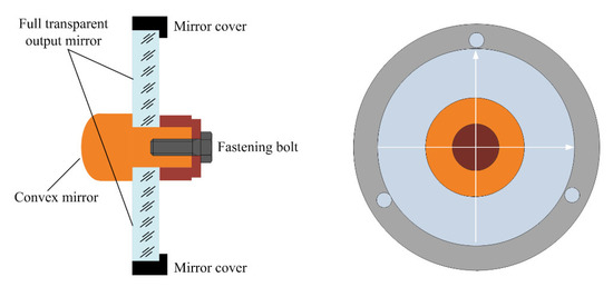 The discharge was formed between electrodes 1 of size 120 × 4 cm, which were spaced by a 4 cm gap. The discharge circuit was the same as that used in Ref. [2]. The positive-branch unstable resonator was formed from concave and convex spherical copper mirrors 2 and 3. The discharge chamber was sealed by the concave mirror 3 and output mirror 4. The convex mirror 2 was axially mounted on a full transparent output mirror 4 made of CaF2, as shown in Figure 5. The convex mirror 2 was cooled by flow gas. Compared with the transverse support installation structure used in Ref. [30] and external cavity structure used in Refs. [25,26,27], the axial mounting inner cavity structure has the advantages of causing no obstruction to the laser beam, having no impact on the output power, causing no distortion in the output beam, being easy to adjust, and having a lower cost.