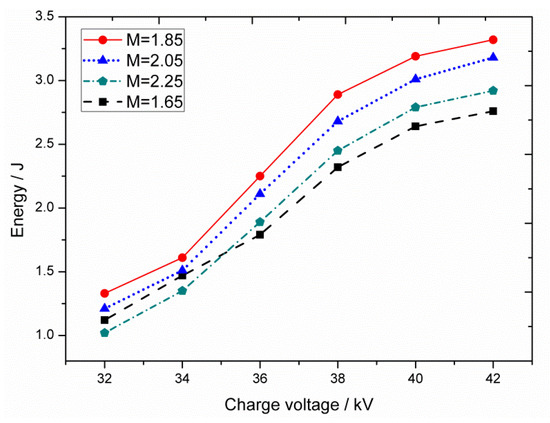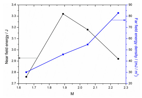 Figure 9 shows the near-field output energy and far-field energy density under different magnifications at charge voltage Uc = 42 kV. The far-field energy density was calculated by ρ = E/Sf, where E is the near-field output energy and Sf is the far-field spot area. Considering the application in remote atmospheric monitoring, the far-field operation range is >10 km. As we can see from Figure 9, the near field energy increased at first and then decreased, with a maximum energy Emax = 3.32 J attained at M = 1.85, while the far-field energy density increased monotonically.