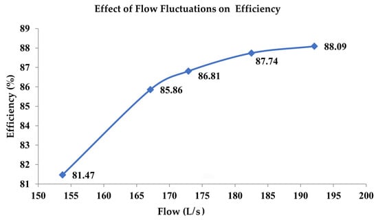 The fluctuation of the flow ”Q” varies the output of the hydro system. A smooth output can be achieved while maintaining a constant flow, which can be accomplished using the aforementioned techniques. A smooth output makes the system more efficient. The effects of flow fluctuations on the efficiency of PAT are shown in Figure 1, in which five scenarios were considered for the calculations based on a previous study []. Notably, the total reduction in flow is 38.4 L/s, which causes a significant decrease of 6.62% in the efficiency of the system. This decrease in plant efficiency is dangerous for the stability of the system.