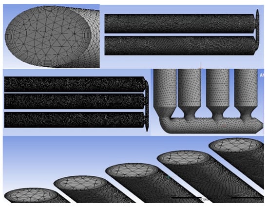 The geometrical dimensions of the PWC were composed in a design modeler, and the settings were changed from solid to fluid, while meshing of the PWC was performed using ANSYS meshing. A tetrahedral mesh was created using a patch-confirming algorithm, and the span angle center was set to fine. Meshing of the PWC is shown in Figure 2, the details of which are provided in Table 2, including the meshing method, inflation layers, element size, and number of elements per PWC.